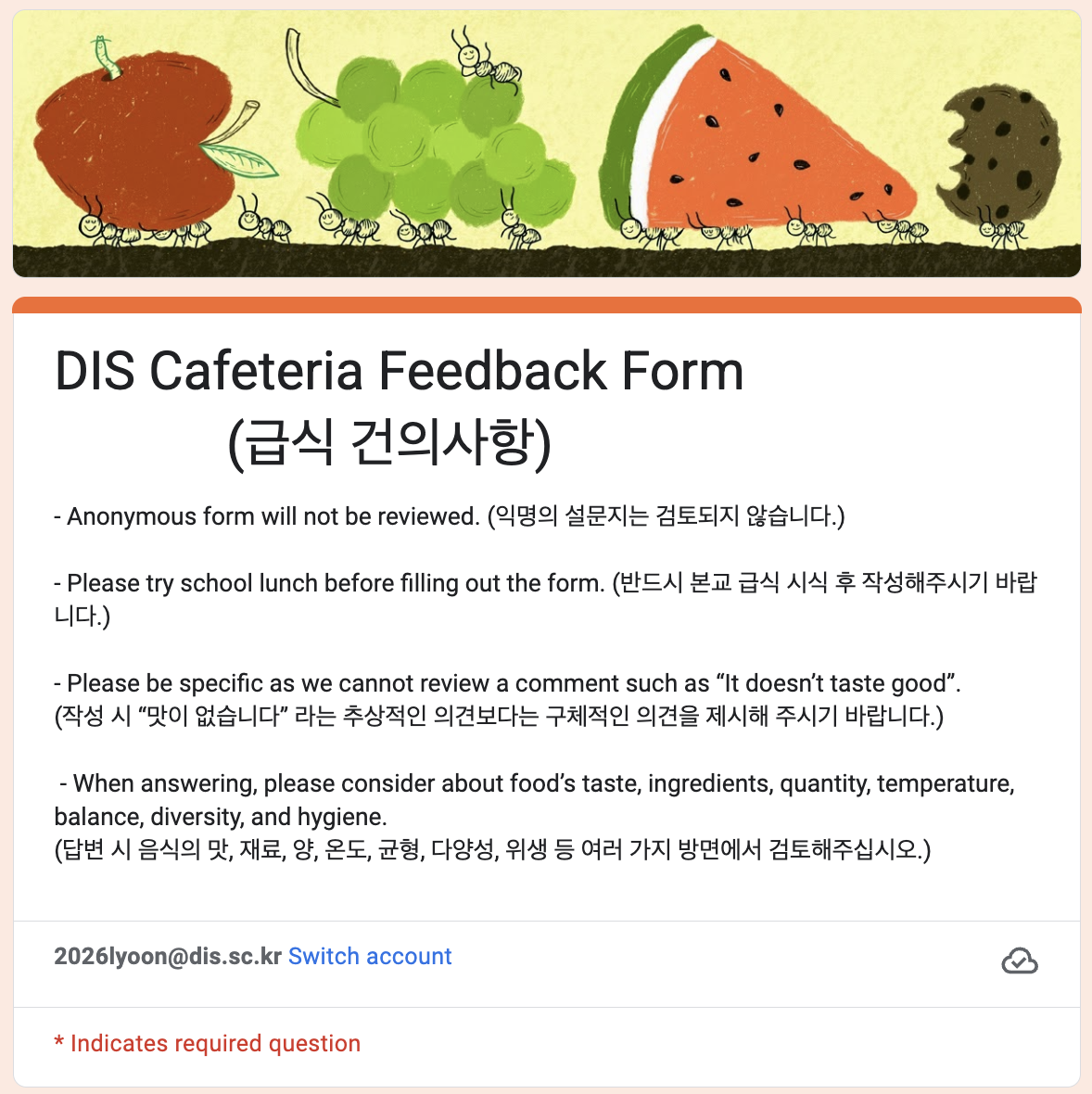 The cafeteria staff and Mr. Choo, DIS business manager, launched the feedback form to allow students and parents to better communicate their preferences. “Students, faculty or even parents can fill out the form after they have eaten the food.” After DIS community members fill out the form, Mr. Choo delivers it to the cafeteria staff.